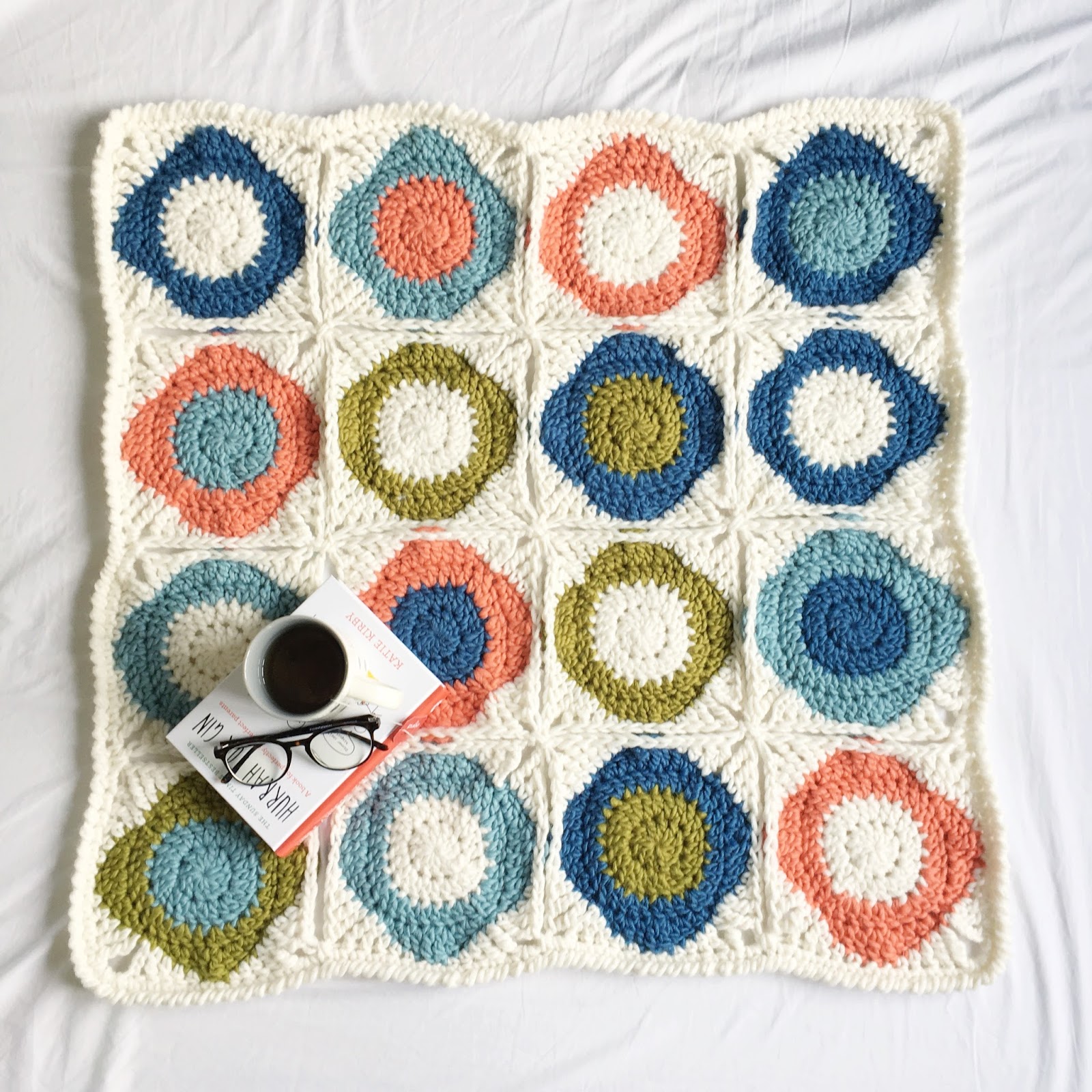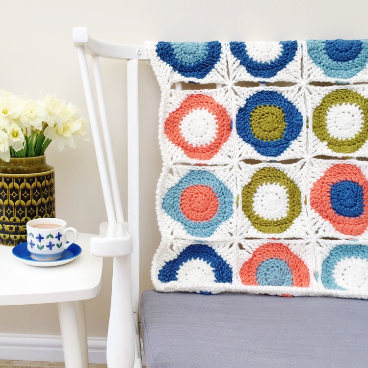 by Lindsey Newns @lottieandalbertA beautiful mid-century-modern inspired lap blanket worked in flower motifs, joined using the join-as-you-go method and finished with a simple double crochet and crab stitch border.