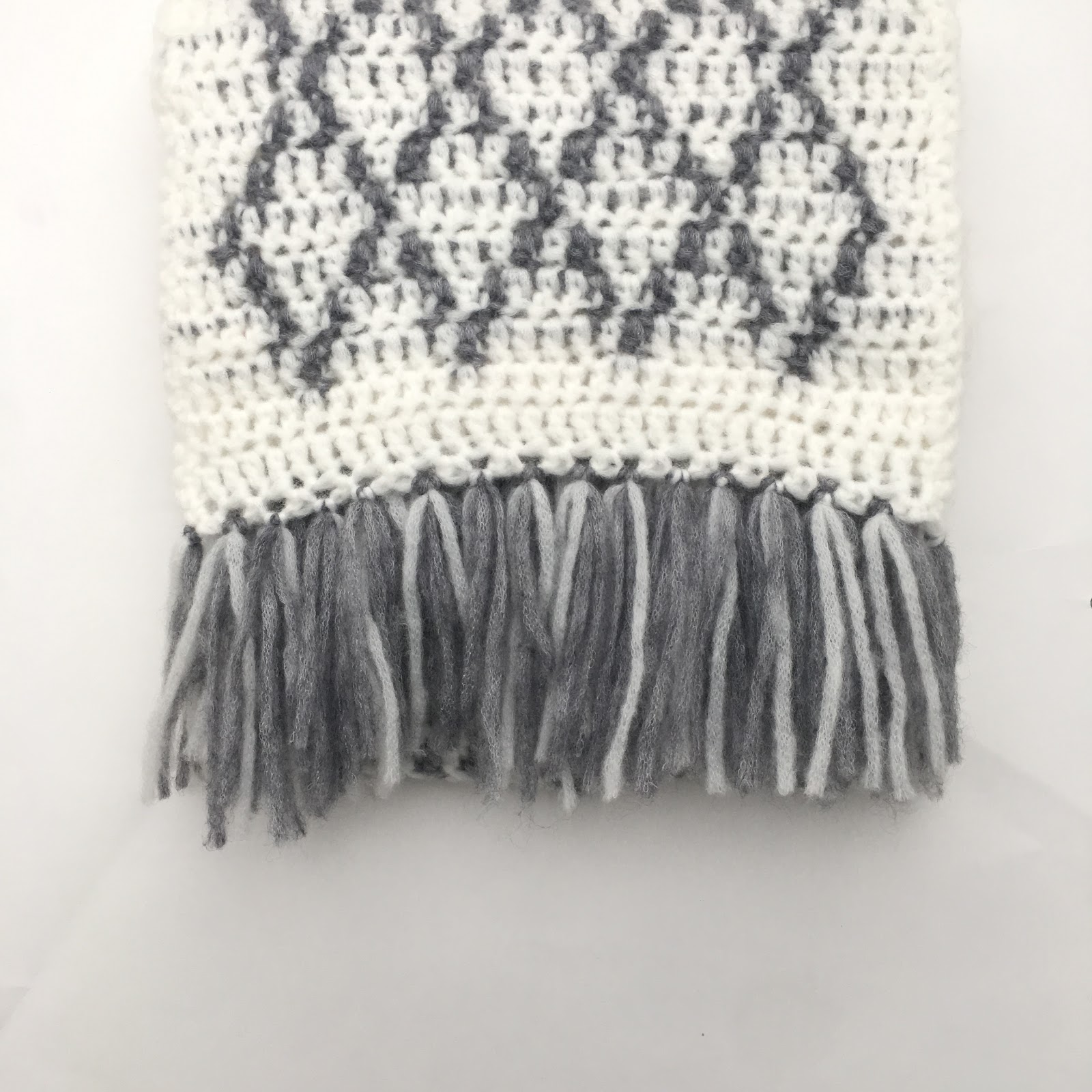 *Insert your crochet hook into one of the chain spaces from front the back, and loop your 3 tassel lengths over the crochet hook. Pull up a loop with the tassel yarn, and yarn over with the rest of the tassel. Now pull through the loop on the hook to secure your tassel. Repeat from * 13 times, and then again at the other end of the scarf.