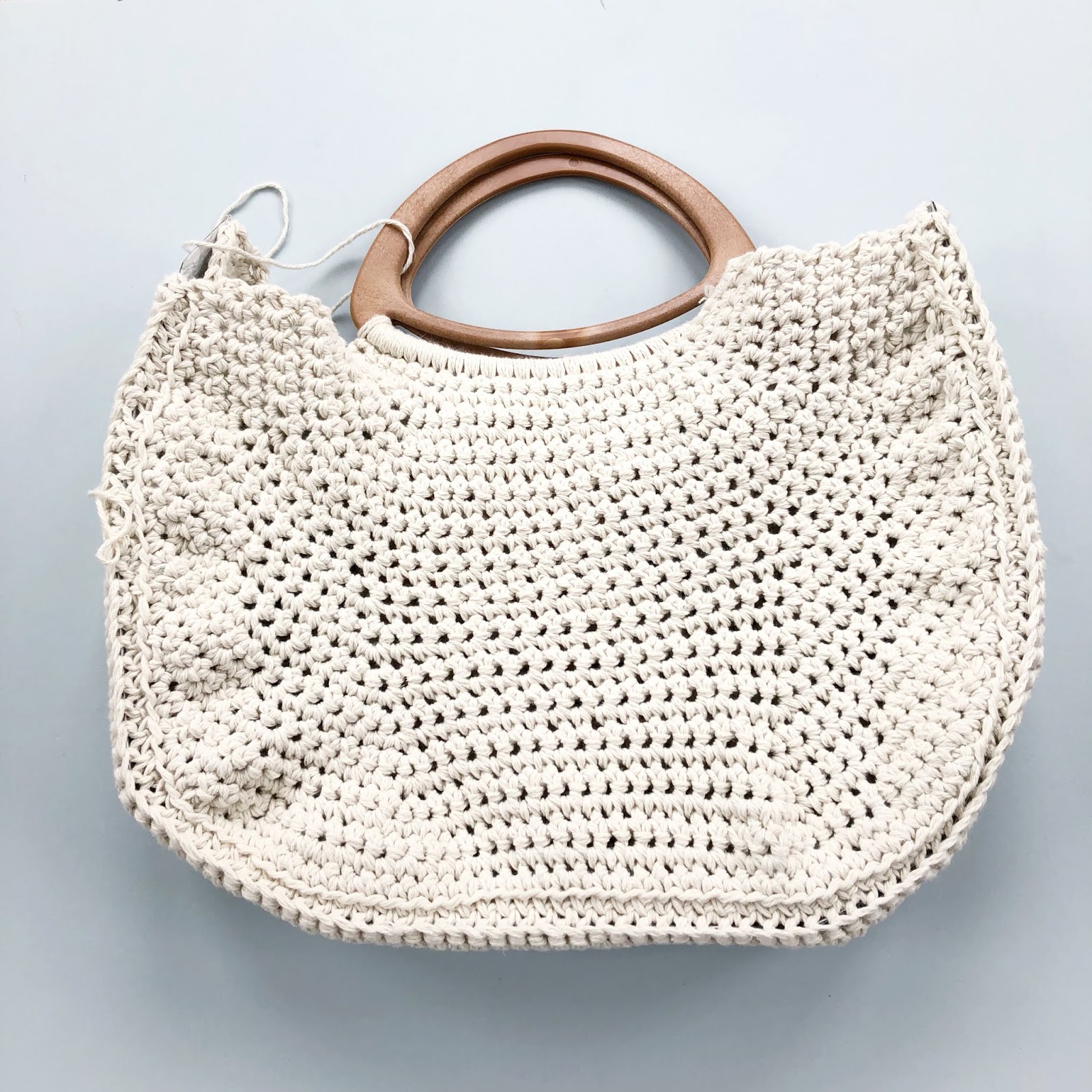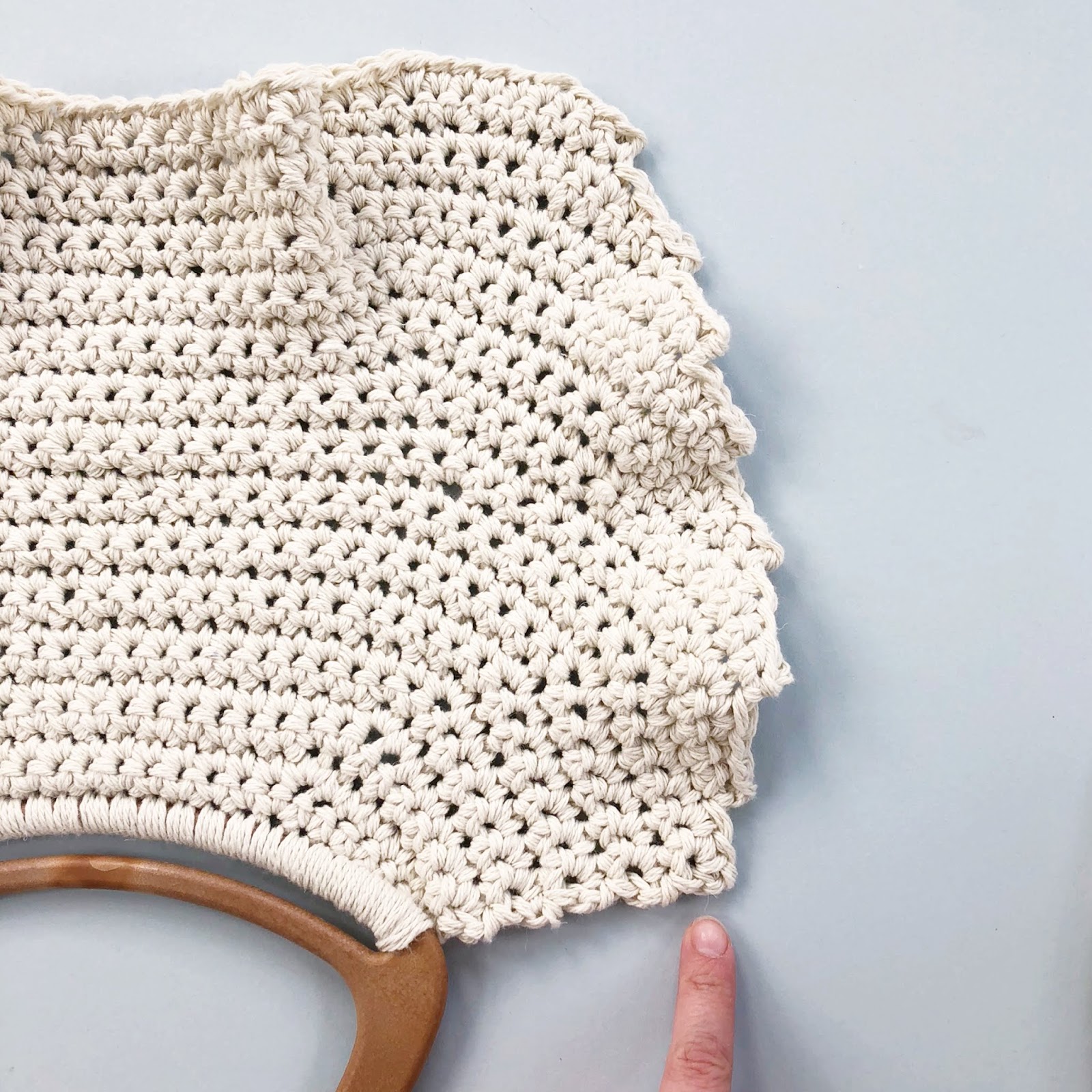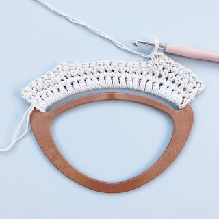 Using a 7mm crochet hook and the yarn held double, make 24dc around the bottom bar of the bag handle, turn. (24 sts)
