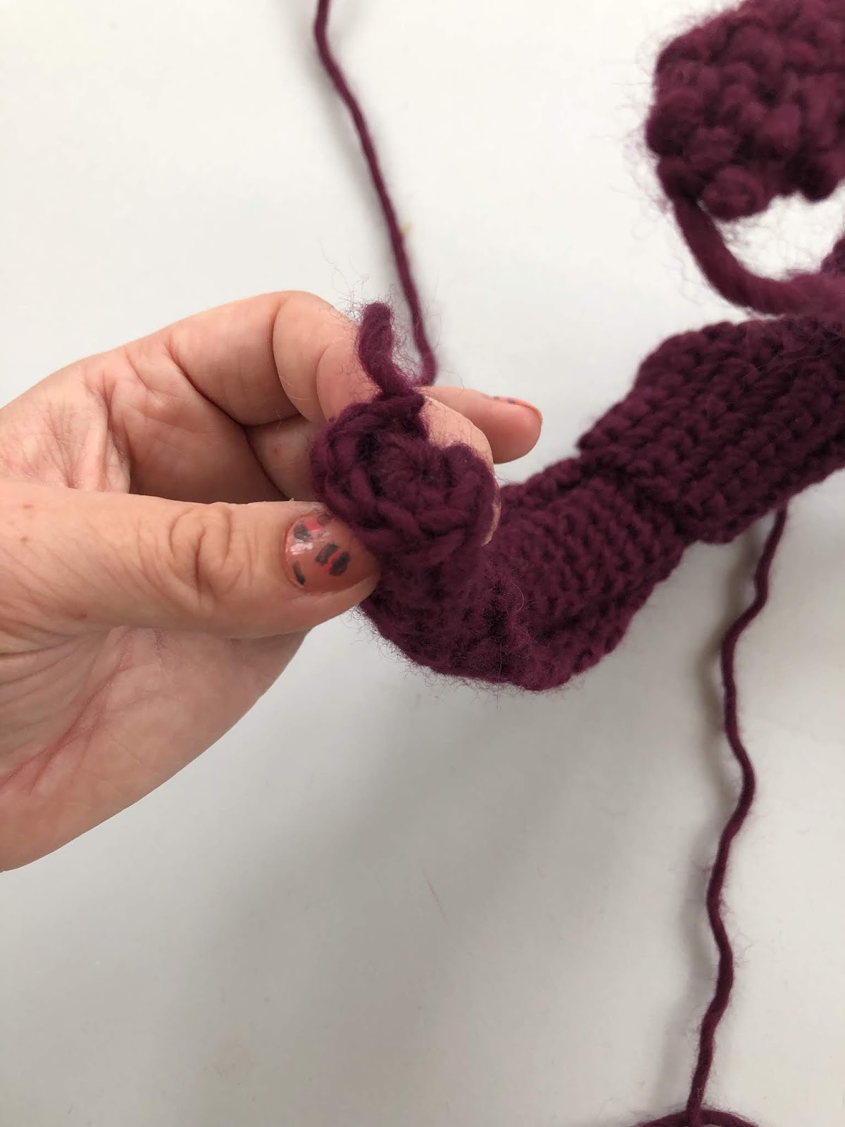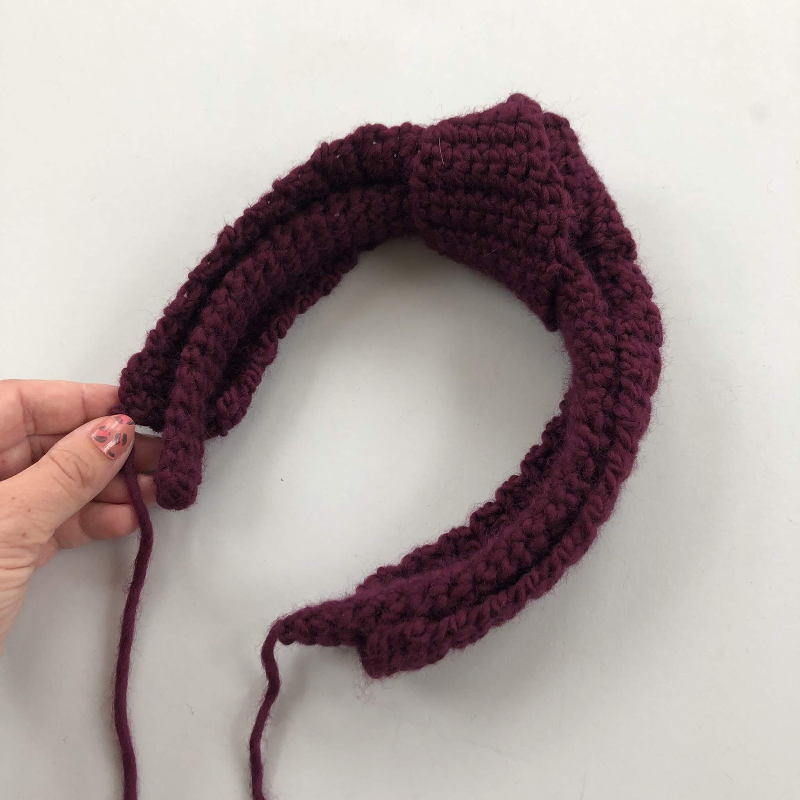At this stage, check your tie knot section is long enough before you fasten off the yarn: find the mid point of the long flat strip you have just made, and tie a knot in the middle, around the headband. Create a knot as tight or as loose as your like the look off, and keep it central on the headband. The two ends of the long flat strip should reach the ends of your headband. If you need to pull gently to get them there, this is fine, but if they are far too short to reach, untie and add a few more rows.