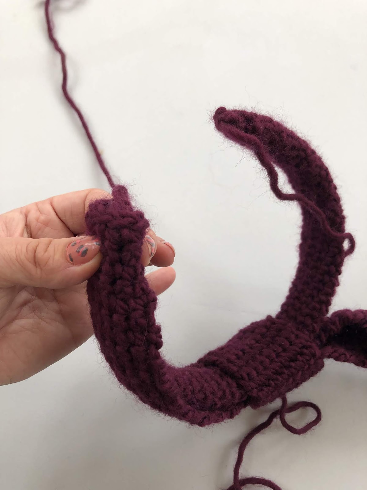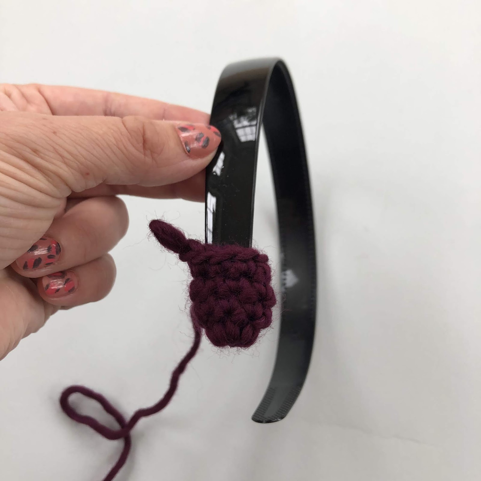 - Sew the ends of the strip section to the end of each hairband, by wrapping the strip round the base of the ends, and bringing the two bottom corners of the strip together on the inside of the headband. Sew the strip to the tube, and fasten off, sewing in any ends. Repeat on the other side.