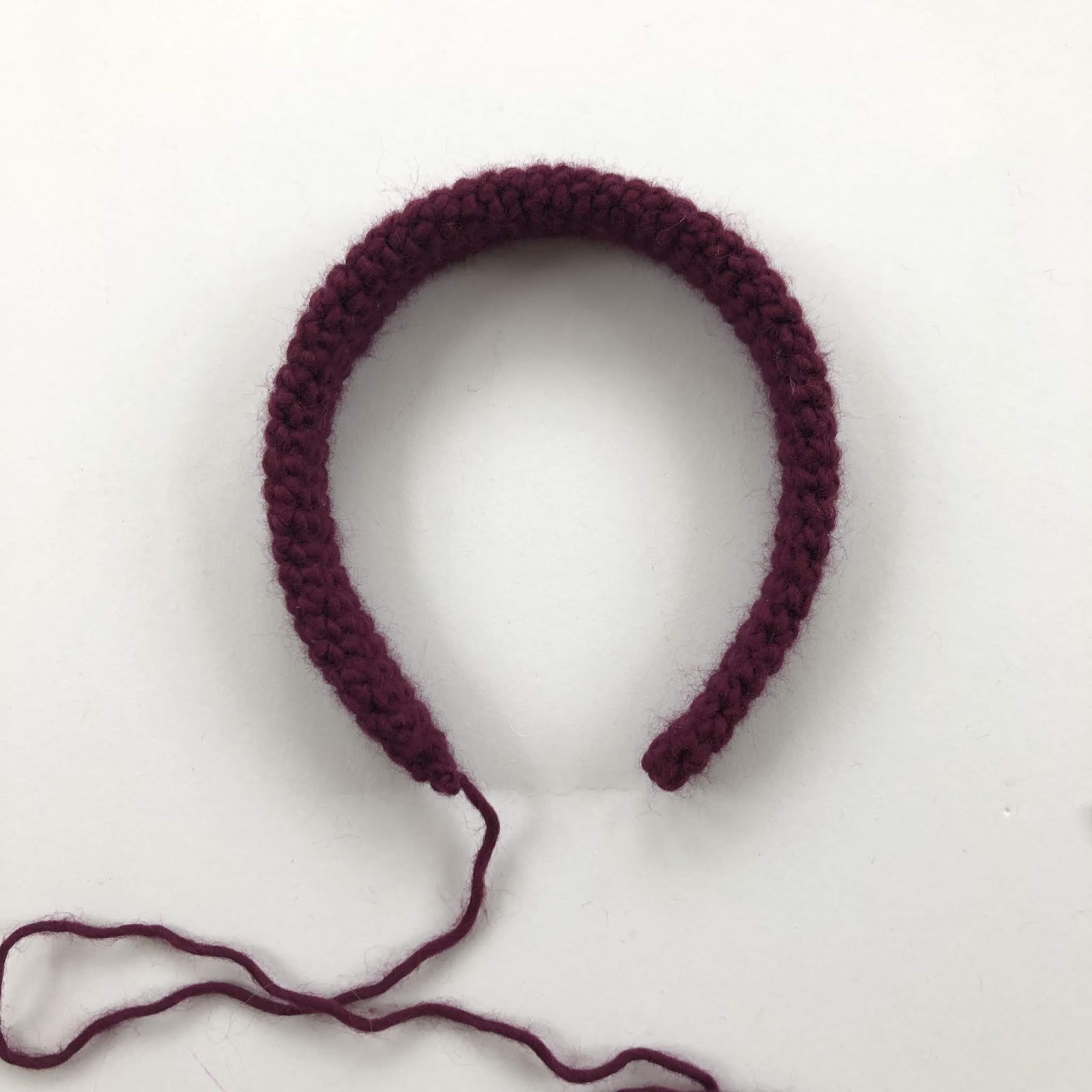 - Continue working double crochets, creating a tube, until your tube measures 41cm/16in (or the same length as your headband). Don't try and crochet around the headband: crochet the tube first and then put the headband in after.