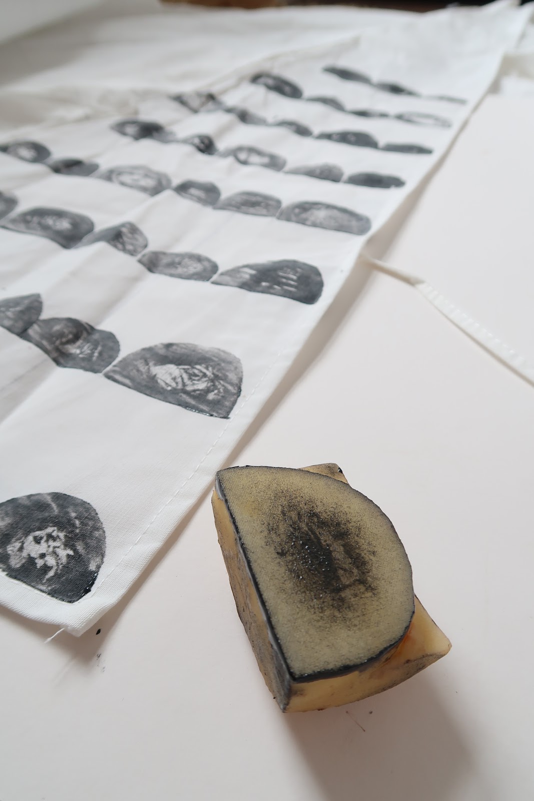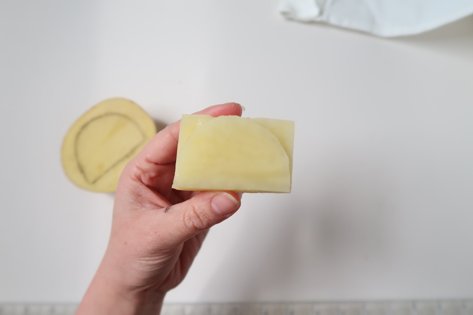 Cut your potato into a rectangle around the half moon shape - this will help you to see where you are placing the shape when it comes to printing. Set your potato stamp aside to dry a little.Step 4