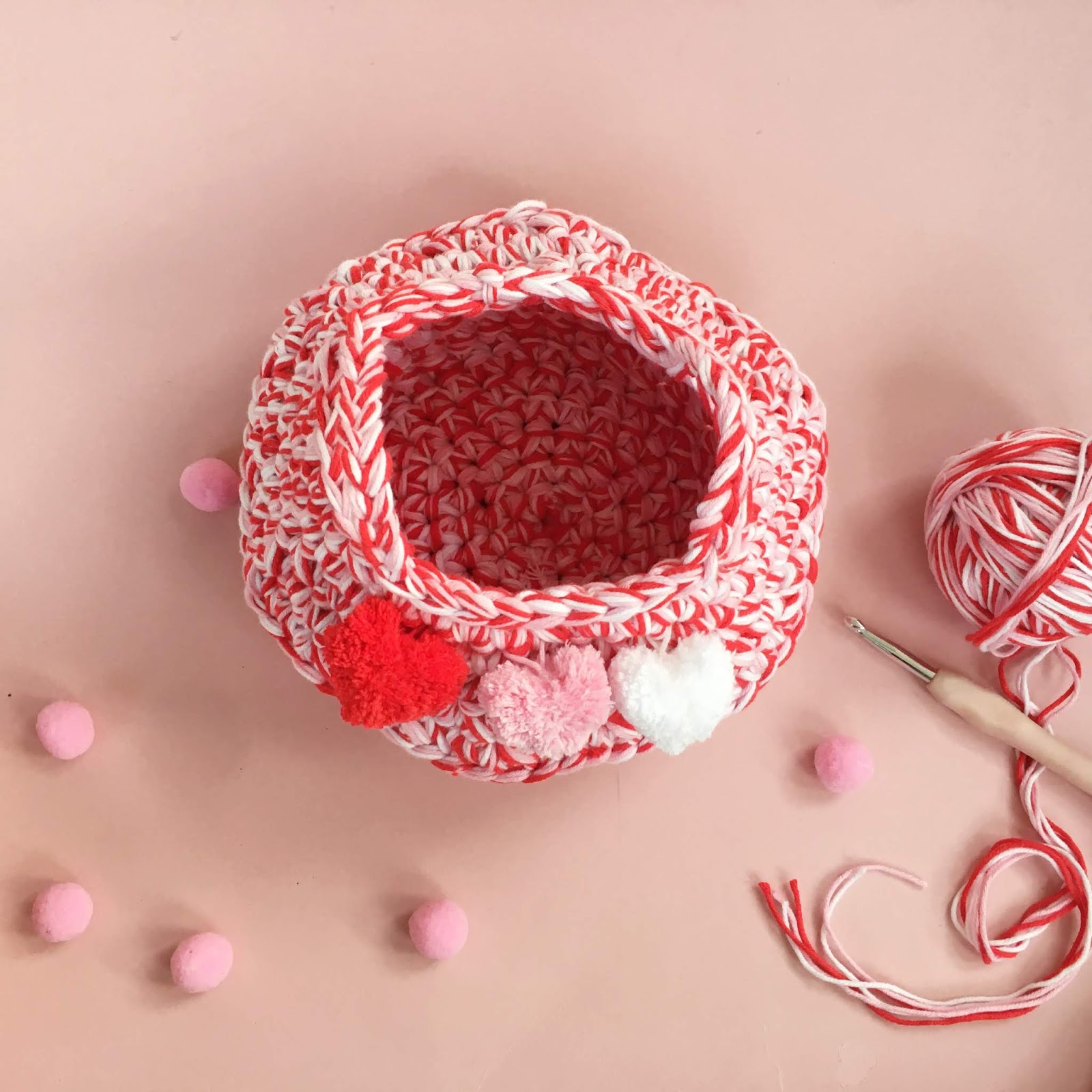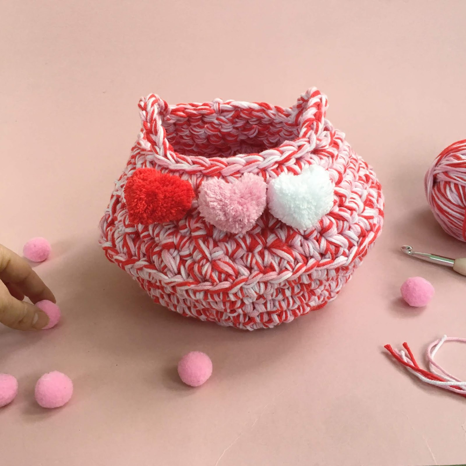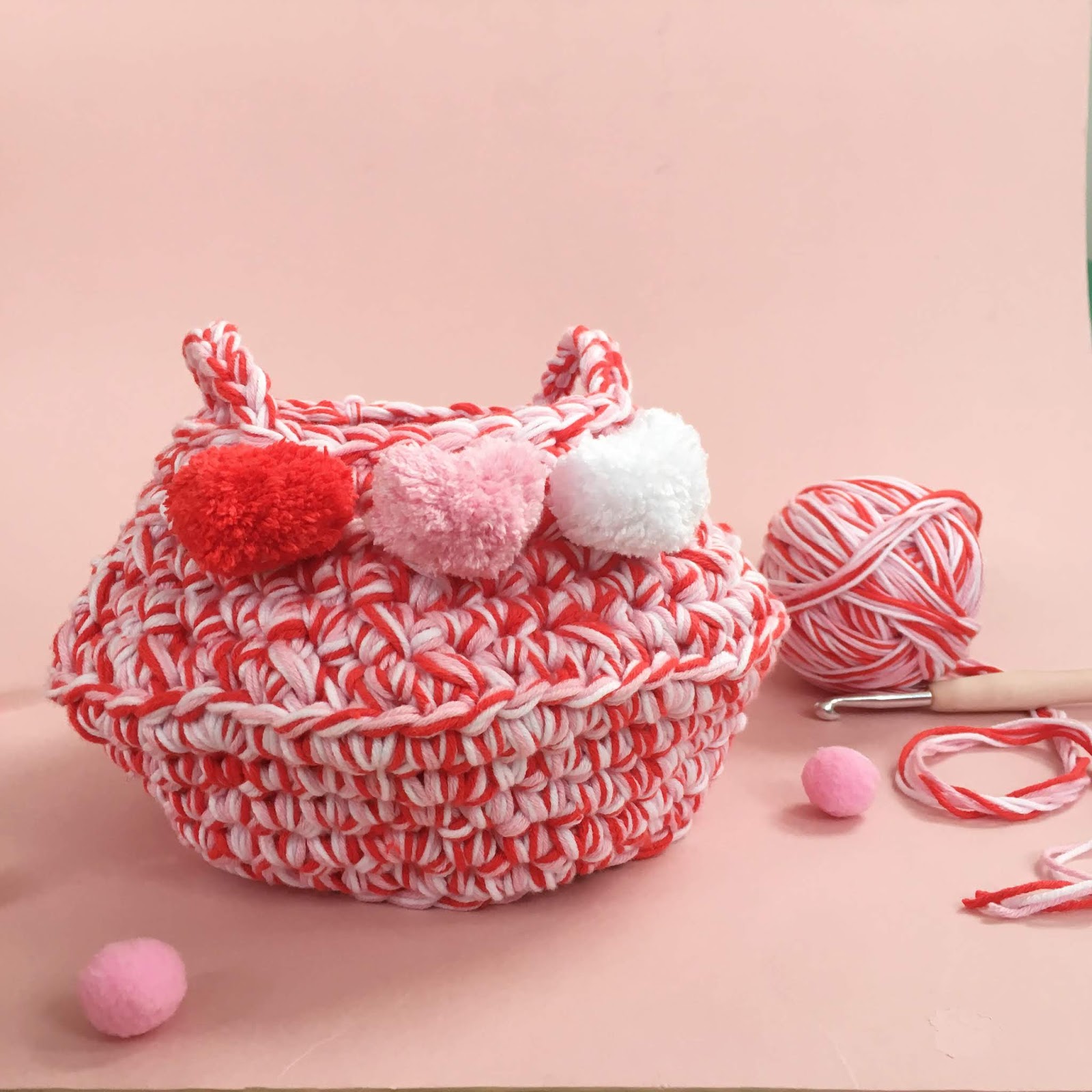 This chunky belly basket is worked in the round and uses six strands of yarn held together, for a fun and quick make. Finished with heart-shaped pompoms! Scroll down for step by step pictures, instructions and stitch descriptions.