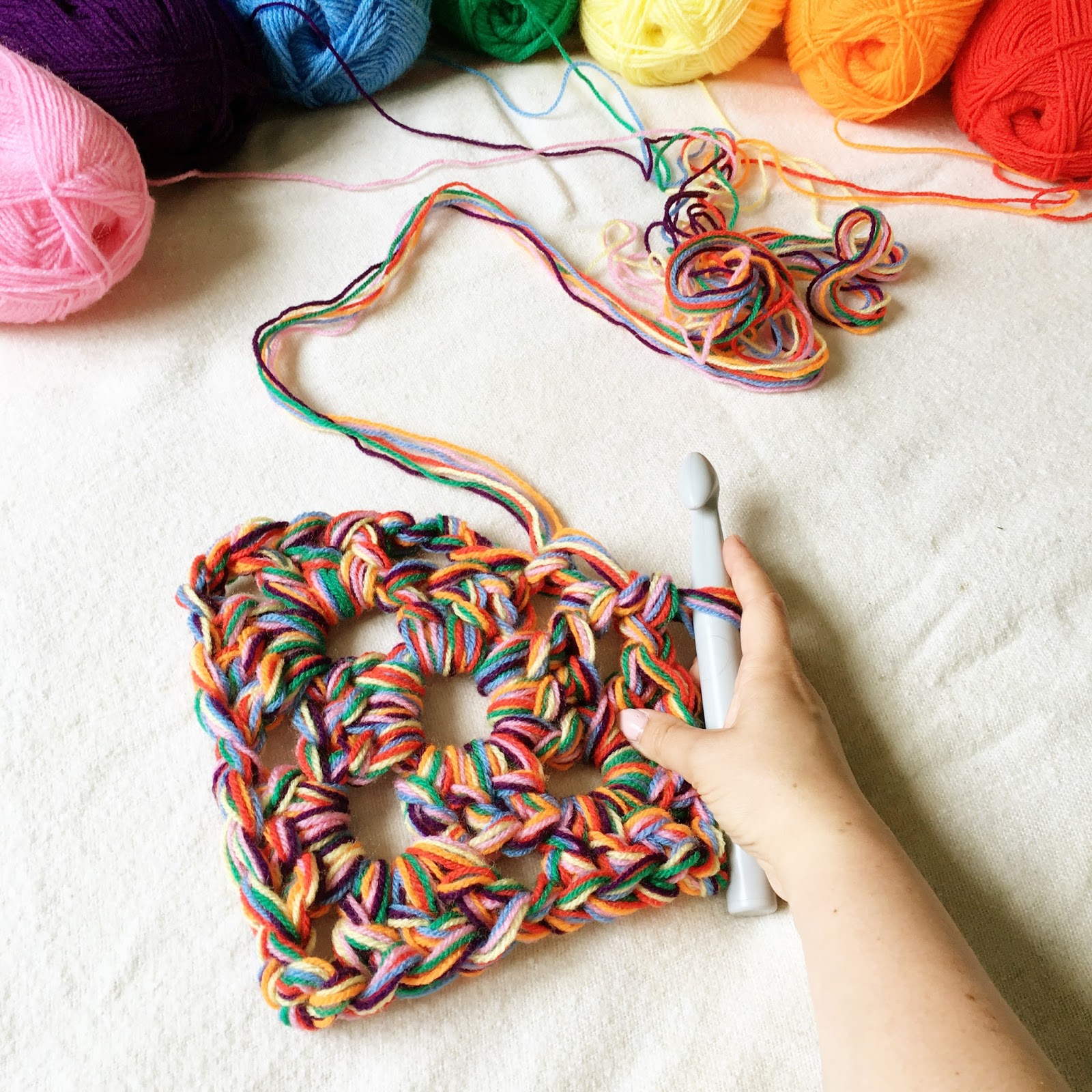 I used Pony's 20mm crochet hook from Amazon (£3), and 6 balls of Marriner acrylic DK (£1 each!) in Red, Jaffa, Sunrise, Emerald, Madonna and Fiesta. I originally chose to use this yarn as a stash buster as I found the acrylic quite stiff for clothes or toys, but actually, once you use 6 of the yarns together, it turns super squishy! So I would fully recommend this very cheap yarn.