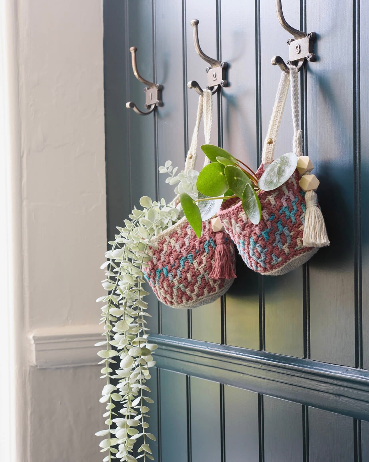 Create two hanging baskets, perfect for plants or yarn supplies, and learning a new technique at the same time.